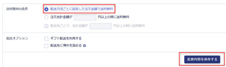 ショップ構築 / 設定 / 配送 / 配送方法設定 の『送料無料の条件』で「配送方法ごとに設定した注文金額で送料無料」を選択し保存します。