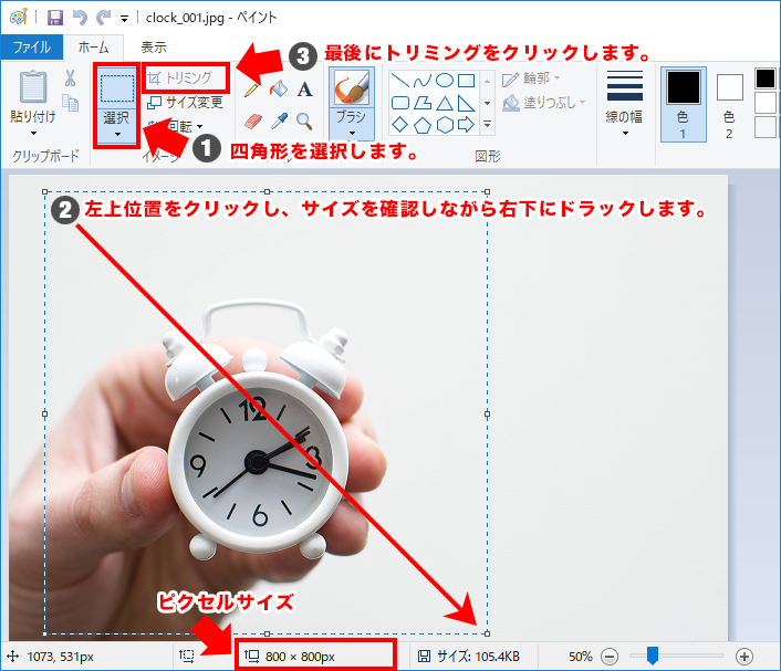 次に、「ペイント」を利用して画像加工が初心者の方でもかんたんに画像を正方形にする方法をご紹介します。