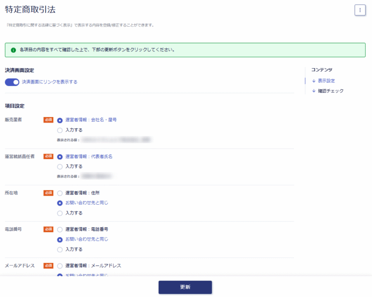 ショップ構築 / 設定 / ショップ情報 / 特定商取引法(必須)