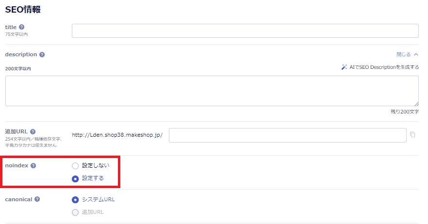 「noindex設定」は、カテゴリ編集や商品編集からも設定することができます。