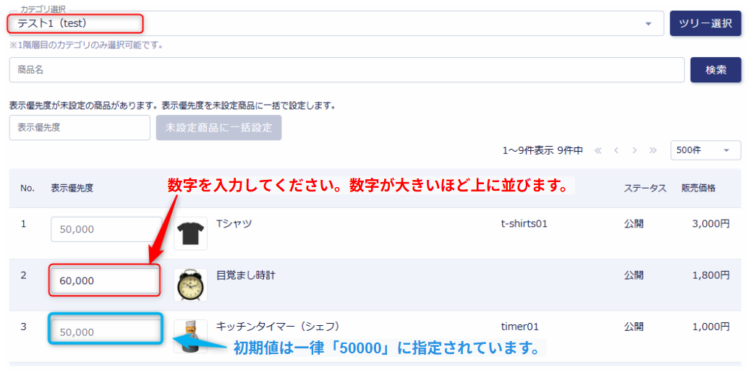 ・数字の指定は商品管理 / 商品一覧 / アップロード・ダウンロード / 商品の並び順一括登録・修正でも可能です。